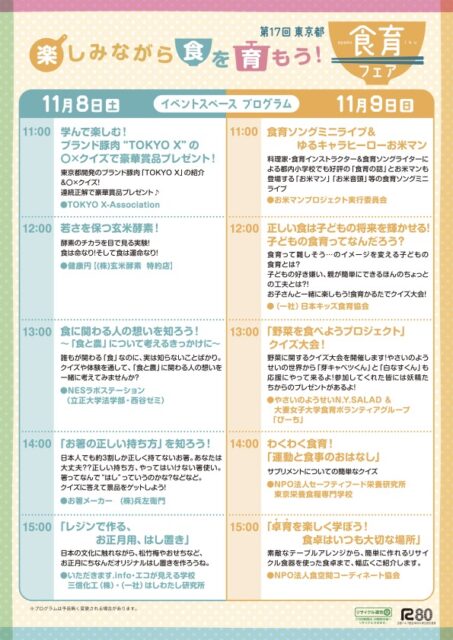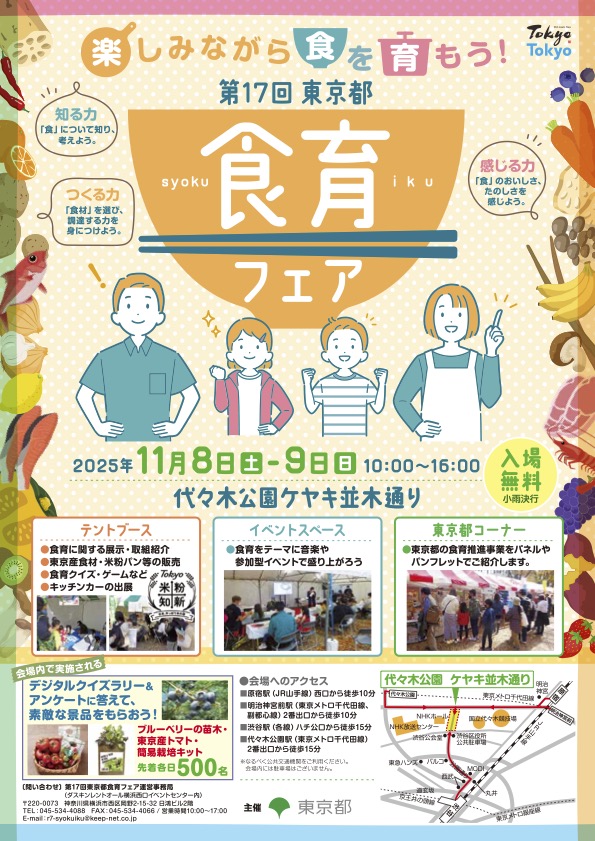 東京都が主催する「第17回東京都食育フェア」は、楽しみながら食育を学べる人気イベント。代々木公園ケヤキ並木通りに、食育活動を行う団体や企業が集まり、体験型ワークショップや展示、東京産の農畜産物販売などが行われます。家族で参加できるお箸づくりやペーパークラフト体験、大学生による発表ステージ、デジタルラリーなど、子どもから大人まで一日中楽しめる内容です。東京の「食」と「農」を体感しながら、未来の食を考えるきっかけになる2日間です。